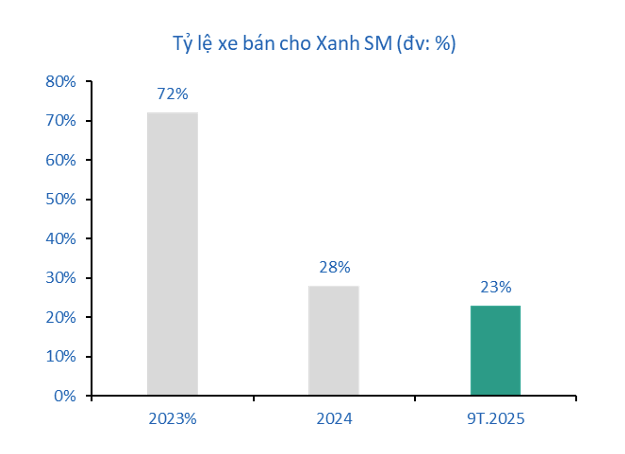 BSC Researchが公表した「Mobility Day」レポートによると、VinFastのXanh SM向け販売比率は、2023年の72%から2024年には28%へ低下し、2025年1〜9月には23%まで下がりました。